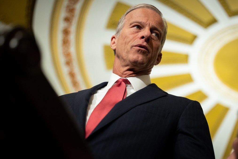 Senate Majority Leader John Thune, R-S.D., speaks at a press conference with other members of Senate Republican leadership following a policy luncheon at the U.S. Capitol on April 21, 2026. (Photo by Nathan Posner/Anadolu via Getty Images)