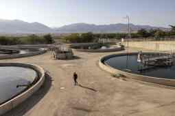 Arik Ashkenazi, chief engineer at the Ein Netafim wastewater treatment plant, walks between water clarifier basins at the facility in Israel’s southern Red Sea port city of Eilat on July 13, 2023. Hemmed in between the Red Sea and a desert, isolated from the rest of Israel and with no natural freshwater, Eilat’s drinking water is a combination of desalinated groundwater and sea water. After its domestic use turns it into sewage, it is treated and then allocated to farmers, enabling the arid region to support an agricultural industry. While Eilat used to be the exception in Israel’s water management, it is now more of a prototype for the country and perhaps to the world. (Photo by MENAHEM KAHANA / AFP) (Photo by MENAHEM KAHANA/AFP via Getty Images)
