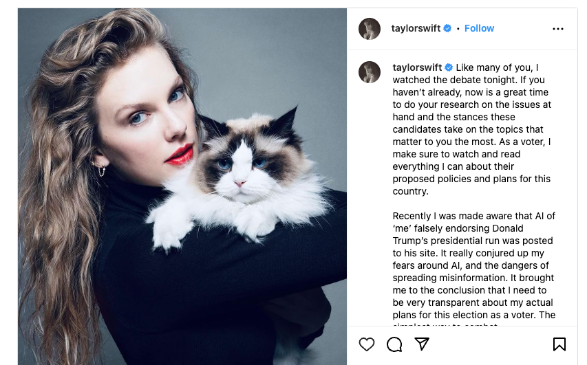 “Recently I was made aware that AI of ‘me’ falsely endorsing Donald Trump’s presidential run was posted to his site,” Swift wrote in an Instagram post officially endorsing Harris. “It really conjured up my fears around AI, and the dangers of spreading misinformation.”