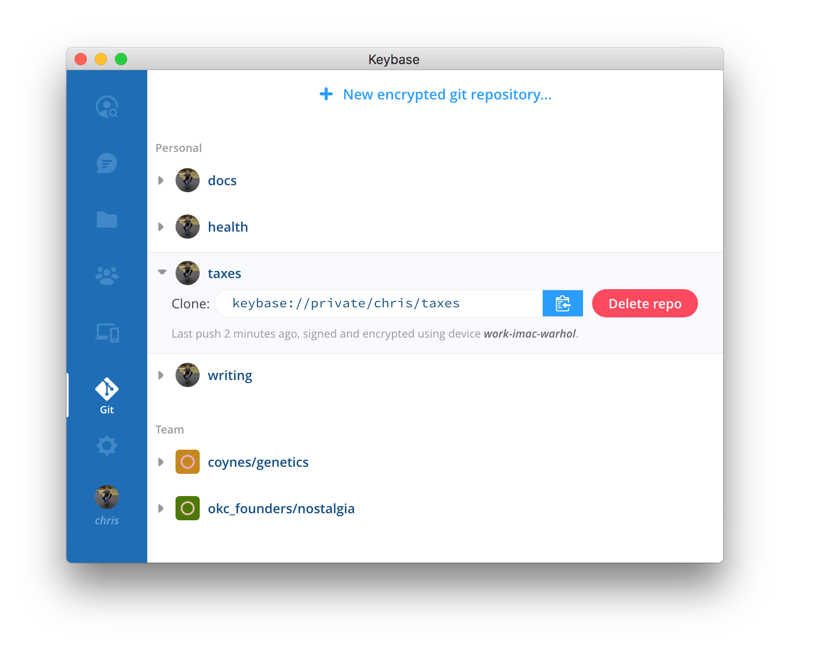 Here’s how encrypted git looks in Keybase’s desktop app: